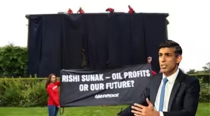ગ્રીનપીસ યુકેએ ઉત્તર ઇંગ્લેન્ડના રિચમન્ડમાં સુનાકની હવેલીની છત પર ચડતા અને તેને કાળી ચાદરથી ઢાંકી રહેલા ચાર કાર્યકરોના વીડિયો પોસ્ટ કર્યા હતા. અન્ય બે કાર્યકરોએ એક બેનર ફરકાવ્યું હતું જેમાં લખ્યું હતું, “ઋષિ સુનક – તેલનો નફો કે આપણું ભવિષ્ય?” બીજી તરફ, ડાઉનિંગ સ્ટ્રીટનું કહેવું છે કે ઊર્જા સુરક્ષા સુનિશ્ચિત કરવા માટે આ નીતિ જરૂરી છે.