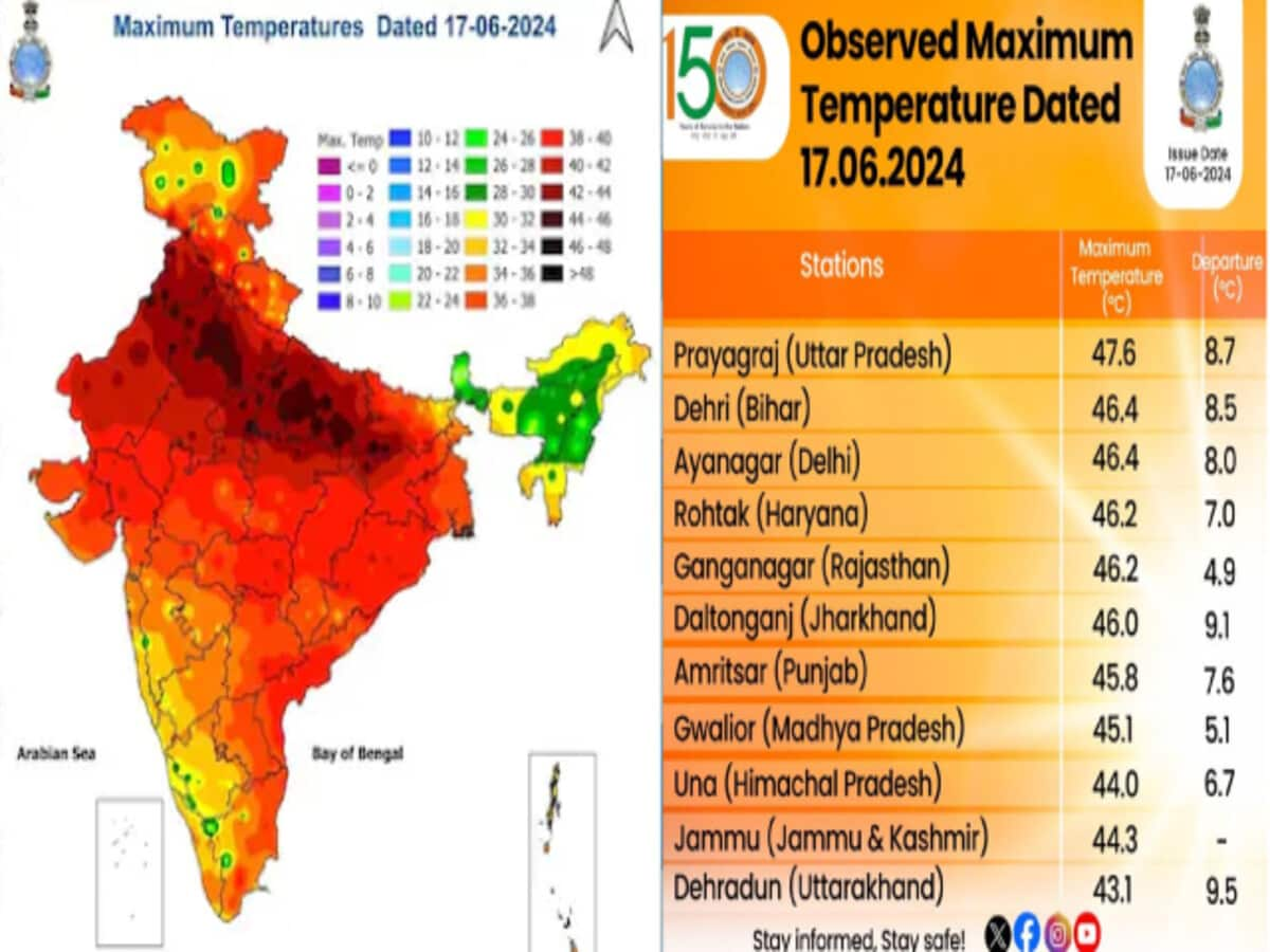 દિલ્હી ઉપરાંત પંજાબ, હરિયાણા, રાજસ્થાન, ઉત્તર પ્રદેશ, બિહાર અને ઝારખંડ સહિત દેશના ઘણા ભાગોમાં તાપમાન રેકોર્ડ બનાવી રહ્યું છે. કેટલીક જગ્યાએ તાપમાન 44થી ઉપર અને અન્ય સ્થળોએ 47થી ઉપર નોંધાયું છે. IMDના નવીનતમ બુલેટિન જણાવે છે કે 17 જૂને ઉત્તર પ્રદેશના પ્રયાગરાજમાં મહત્તમ તાપમાન 47.6 ડિગ્રી નોંધાયું હતું, જે સામાન્ય કરતાં 8.7 ડિગ્રી વધુ છે. બિહારના પુત્ર દેહરી ટોચના 10 શહેરોની યાદીમાં બીજા સ્થાને હતું, જ્યાં મહત્તમ તાપમાન 46.4 ડિગ્રી નોંધાયું હતું જે સામાન્ય કરતાં 8.5 ડિગ્રી વધુ છે.