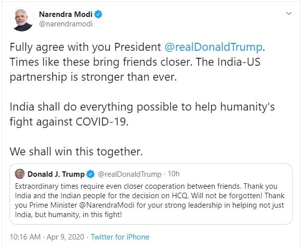 અમેરિકાના રાષ્ટ્રપતિ ડોનાલ્ડ ટ્રમ્પે ફરી એકવાર વડાપ્રધાન મોદીની પ્રશંસા કરી છે. તેમણે મોડી રાત્રે ટ્વિટ કરીને પીએમ મોદીનો આભાર માન્યો છે. સંકટના સમયમાં હાઈડ્રોક્સીક્લોરોક્વિન દવા આપવાને લઈને તેમણે પીએમ મોદીની પ્રશંસા કરી. તેમણે ટ્વિટ કરતા લખ્યું કે અસાધારણ સમયમાં દોસ્તોની વચ્ચે ઘનિષ્ઠ સહયોગની આવશ્યક્તા હોય છે. હાઇડ્રોક્સીક્લોરોક્વિનથી સંબંધિત નિર્ણય માટે ભારત અને ભારતીયનો આભાર. અમે આ નહીં ભૂલીએ…ટ્રમ્પના ટ્વીટ બાદ વડાપ્રધાન નરેન્દ્ર મોદીએ પણ ટ્વીટ કરીને ભારત અને અમેરિકાના સંબંધો મજબૂત છે અને મુશ્કેલીના સમયમાં એક મિત્ર કામ આવે છે તેવુ ટ્વીટ કર્યુ હતું.
