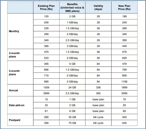 Jio બાદ એરટેલે પણ પ્રીપેડ અને પોસ્ટપેડ પ્લાનની કિંમતોમાં વધારો કર્યો છે. એરટેલે હવે 179 રૂપિયાના માસિક પ્લાનની કિંમત ઘટાડીને 199 રૂપિયા કરી દીધી છે જેમાં તમને દરરોજ 2GB ડેટા, અમર્યાદિત કૉલિંગ અને 100 SMS પ્રતિદિન મળશે. 1,799 રૂપિયાના વાર્ષિક પ્લાનની કિંમત હવે 1,999 રૂપિયા થઈ ગઈ છે. અહીં સંપૂર્ણ સૂચિ જુઓ:
