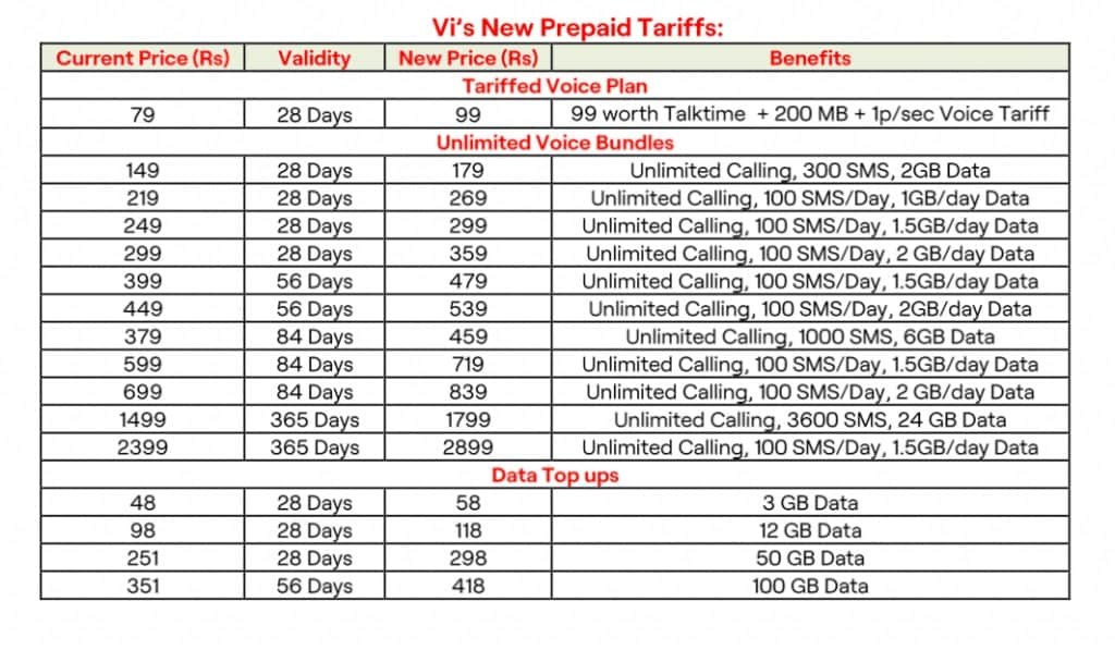 તમને જણાવી દઈએ કે વોડાફોન-આઈડિયાના પ્લાન 4 જુલાઈથી મોંઘા થઈ જશે. આવી સ્થિતિમાં, Vi યુઝર્સને જૂના પ્લાનથી રિચાર્જ કરવા માટે ઓછો સમય મળે છે. Viનો બેઝિક પ્લાન જેની કિંમત 179 રૂપિયા છે, તેની કિંમત 4 જુલાઈથી 199 રૂપિયા હશે. તેવી જ રીતે, કંપનીએ તેના ટેરિફ પ્લાનની કિંમતમાં લગભગ 20 ટકાનો વધારો કર્યો છે. જ્યારે વોડાફોનનો 1799 રૂપિયાનો પ્લાન 1999 રૂપિયાનો થઈ ગયો છે. આ Vi ના નવા પ્લાનની યાદી છે: