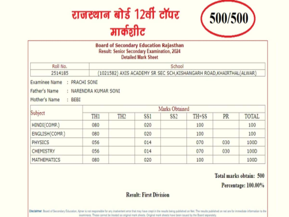 ખૈરથલની પ્રાચી સોનીએ રાજસ્થાન બોર્ડના 12માના પરિણામમાં ઈતિહાસ રચ્યો છે. અલવર નજીક કિશનગઢ રોડ, ખૈરથલ ખાતે આવેલી એક્સિસ એકેડમી સિનિયર સેકન્ડરી સ્કૂલની વિદ્યાર્થીની પ્રાચીએ 500માંથી 500 માર્ક્સ મેળવીને સમગ્ર રાજ્યમાં ટોપ કર્યું છે. RBSE રાજસ્થાન બોર્ડ 12મા વિજ્ઞાન પ્રવાહની વિદ્યાર્થીની પ્રાચીએ 100 ટકા માર્કસ મેળવ્યા છે. તેણે હિન્દી, અંગ્રેજી, રસાયણશાસ્ત્ર, ગણિત, ભૌતિકશાસ્ત્ર એમ પાંચેય વિષયોમાં 100માંથી 100 ગુણ મેળવ્યા છે. ઉપર તમે પ્રાચીની માર્કશીટ જોઈ શકો છો. પ્રાચીએ જણાવ્યું કે તે IAS ઓફિસર બનવા માંગે છે. તેણે પોતાની સફળતાનો શ્રેય તેના શિક્ષકો અને પરિવારના સભ્યોને આપ્યો.