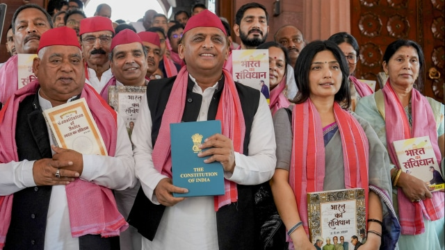 લોકસભા ચૂંટણી બાદ સંસદના પ્રથમ સત્રનો સોમવારે પ્રથમ દિવસ હતો. આ દરમિયાન પીએમ નરેન્દ્ર મોદી, ગૃહમંત્રી અમિત શાહ સહિત તમામ સાંસદોએ સભ્યપદના શપથ લીધા હતા. એટલું જ નહીં, 18મી લોકસભાનો આ પહેલો દિવસ પણ એકબીજાને મળવાનો અને જાણવાનો સમય હતો. આ દરમિયાન અખિલેશ યાદવ પોતાના સાંસદો સાથે અલગ અંદાજમાં જોવા મળ્યા હતા. સમાજવાદી પાર્ટીના તમામ 37 સાંસદો પાસે બંધારણની નકલ હતી. અખિલેશ યાદવે કહ્યું કે અમે બંધારણને લઈને જઈ રહ્યા છીએ જેથી એવો સંદેશ આપી શકાય કે બંધારણને નુકસાન ન પહોંચાડી શકાય, જે સત્તાધારી પાર્ટી કરવાનો પ્રયાસ કરી રહી છે. કોંગ્રેસના વરિષ્ઠ નેતા રાહુલ ગાંધીએ પણ આવું જ કહ્યું હતું.