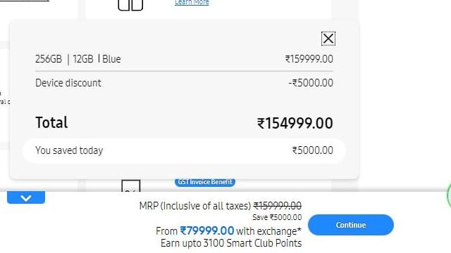સેમસંગની ઓફિશિયલ વેબસાઈટ પર તમારા માટે ફરી એકવાર મજબૂત ઓફર લાઈવ છે. આ અદ્ભુત ઓફરમાં, તમે સેમસંગનો ફોલ્ડેબલ ફોન Galaxy Z Fold 5 તમામ ઑફર્સ સાથે MRPની અડધી કિંમતે ખરીદી શકો છો. ફોનના 12 જીબી રેમ અને 256 જીબી ઇન્ટરનલ સ્ટોરેજવાળા વેરિઅન્ટની એમઆરપી 1,59,999 રૂપિયા છે. કંપની તેને 1,54,999 રૂપિયામાં ડિસ્કાઉન્ટ પછી ઓફર કરી રહી છે.