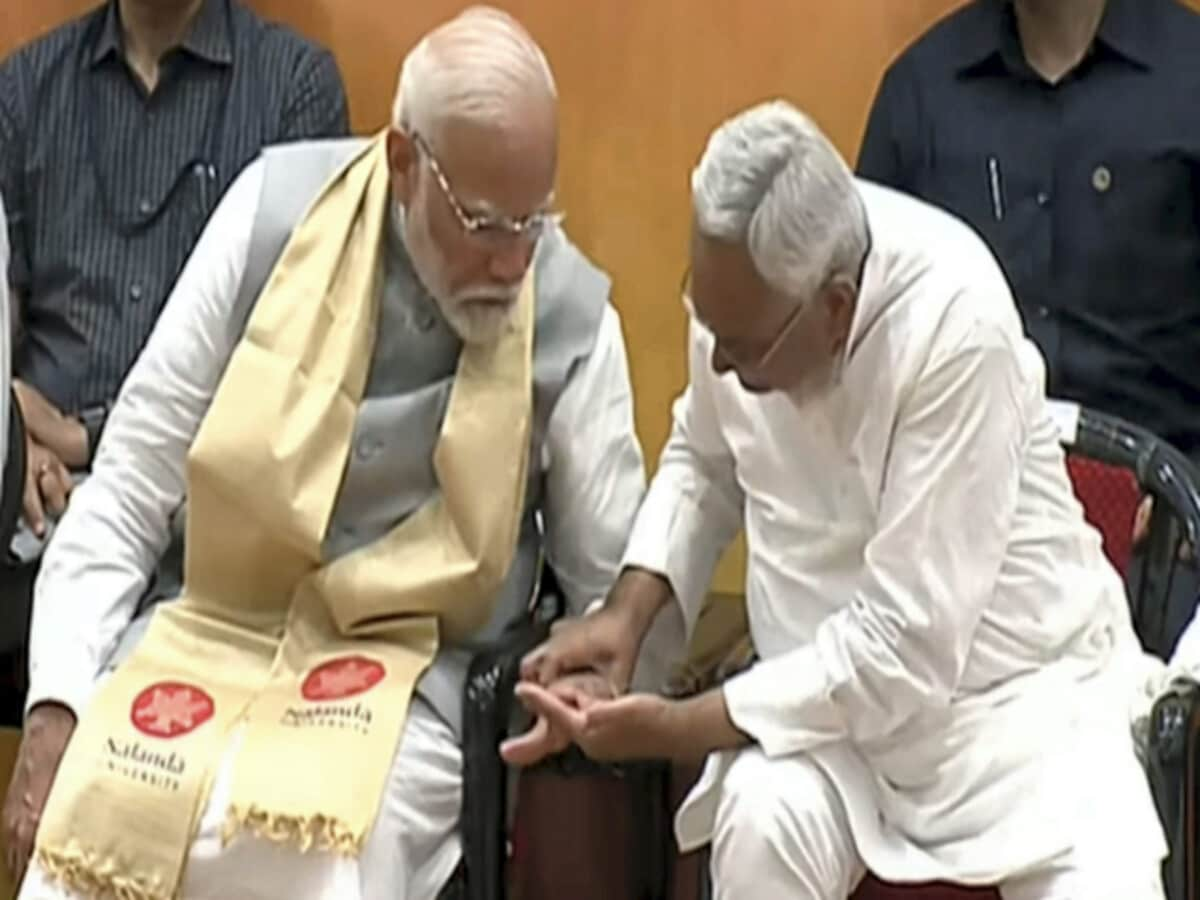 PM નરેન્દ્ર મોદી આજે નાલંદા યુનિવર્સિટીના કેમ્પસનું ઉદ્ઘાટન કરવા બિહારના રાજગીર પહોંચ્યા હતા. આ દરમિયાન સોશિયલ મીડિયા પર એક વીડિયો પણ વાયરલ થઈ રહ્યો છે, જેમાં નીતિશ કુમાર પોતાની આંગળી તરફ જોઈ રહ્યા છે. વીડિયોમાં જોવા મળી રહ્યું છે કે નીતિશ કુમાર પીએમ મોદીના ડાબા હાથની આંગળી જોઈ રહ્યા છે, જેના પર વોટિંગ દરમિયાન શાહી લગાવવામાં આવી હતી. આટલું જ નહીં, આ પછી તે પીએમ મોદીને પોતાની આંગળી પણ બતાવે છે, જેના પર શાહી છે. આ ઘટના ત્યારે બની જ્યારે નાલંદા યુનિવર્સિટીના ચાન્સેલર અરવિંદ પનાગરિયા કેમ્પસના ઉદ્ઘાટન કાર્યક્રમને સંબોધિત કરી રહ્યા હતા.